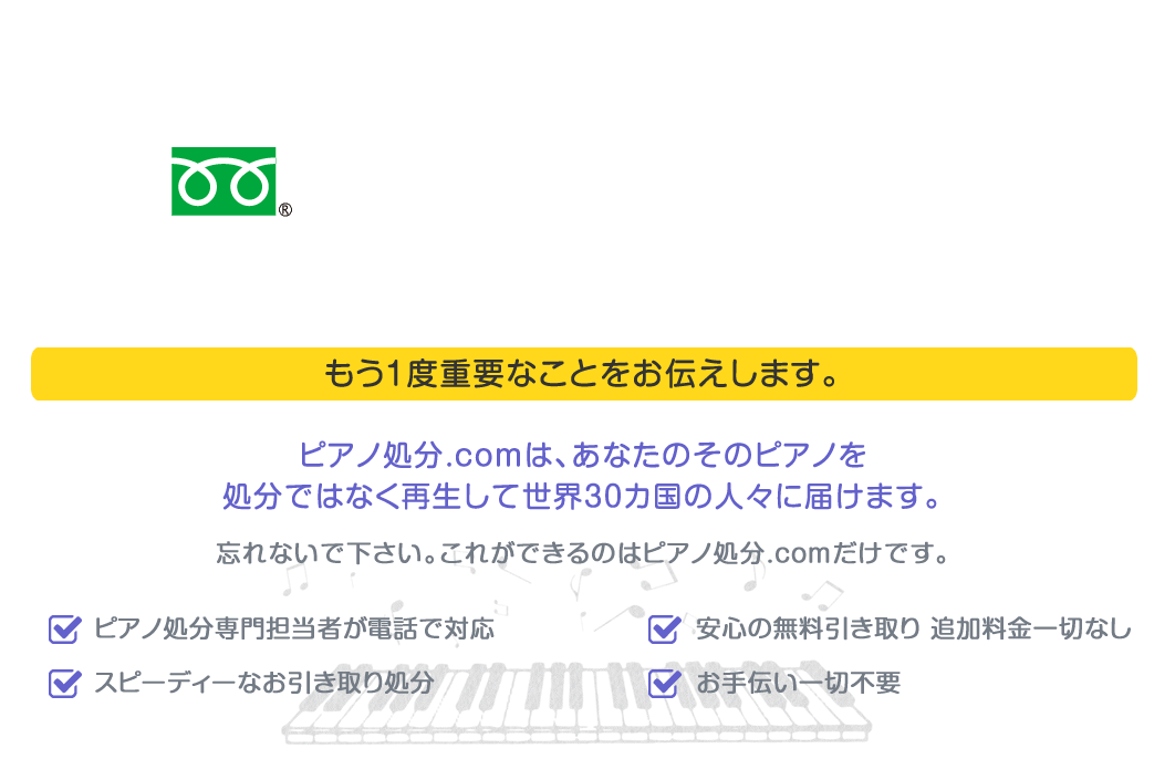 家にあるピアノといえば壁に沿って設置するアップライト型のピアノが一般的でしたが、最近では電子ピアノに移り変わり、置き場所や移動に困る昔ながらのピアノは減る傾向があります。 墨田区内でも同様に昔ながらの木製ピアノは少なくなっていますが、子供が小さいころにピアノを習い始め購入したけれでも成長に伴いピアノ教室をやめてしまい、未だに何十年も使わなくなってしまったピアノが置き去りになっているご家庭が多いようです。 ピアノは約250キロもあり一般の方には運べる重さではないため、専門の業者による搬出が必要となります。 使っていないのから処分したいけれども、ピアノを処分する方法がわからず何十年もそのままになっている模様 墨田区ではアップライトピアノやグランドピアノの処分を行っていません。補助金などの制度もありません。墨田区では50キログラム以内の電子ピアノであれば、大型家電と同じ扱いとなり、粗大ごみとして回収ができますが、アップライトピアノやグランドピアノは対象外となります。自ら専門のピアノ引き取り業者へ依頼する必要があります。 墨田区の粗大ごみについてのHP https://www.city.sumida.lg.jp/kurashi/gomi_recycle/kateikei/gomi_dashikata/sodaigomi.html 自分で運び処分しようとすると約250キロもあるピアノは一般の方には運べる重さではないため、ピアノ運搬を専門とする業者による搬出が必要となります。ピアノは外装は木でできていますが、中身は金属の塊のため廃棄できる場所は限られていますし、もし譲りたい場合は譲る相手やピアノ運搬専門の業者も探さなければなりません。様々なことを考慮するとピアノ処分の専門業者に任せた方が良いでしょう。 墨田区内のピアノの引き取りはピアノ処分.comが行っています。 概ね40年位前までのヤマハとカワイのピアノを無料で引き取りしています。 ピアノ処分.com TEL 0120‐696‐800 受付時間:9時~20時 年中無休 ※多くのピアノを受け入れられるよう努めておりますが、一部機種・状態・搬出状況によりお引取りできない場合もあります。まずはお電話にてご相談ください。 ヤマハ・カワイ以外のピアノと電子・電気ピアノのお引き取りは行っていません。 一般家庭に多い縦型のアップライトピアノは約250kgあります。 ピアノなど重量物の運搬は、重いものを運ぶ特殊な訓練を受け、場合に応じた搬出用の道具を使って行います。 一般の方が何人集まっても持ち上げられる重さではありませんし、持てる場所も限られているため運んでいる途中に手を滑らせピアノの下敷きになってしまったら骨折では済まされません。 もしピアノを倒してしまえば、家の床や壁を破損してしまいます。ピアノが壊れてしまうだけでなく、家の破損した箇所も大工さんに修復を依頼しなければなりません。 木製のピアノはデリケートなため、少し傾けただけでピアノの部品が割れ歪んでしまう可能性があります。ペダルや足元のローラーの部分も折れやすく割れやすい部品です。 ピアノの運搬を行えるピアノ引取りの専門業者でないと運搬作業は困難かと思われます。ピアノ処分を専門に行っている業者でない場合は、運搬に失敗し思わぬトラブルに巻き込まれる場合もあります。 墨田区内でもピアノを専門としない廃品業者へピアノの引取りを依頼した際の、ピアノを運び出す際に家を傷つけてしまったといったトラブルが想定されます。 ピアノ処分.comではお客様に安心して頂けるように毎日ピアノを運んでいる専門スタッフにてお伺いさせていただいております。 ピアノ処分でお困りの際はお気軽にお問い合わせください。 墨田区内の全域でお伺いできます 両国 錦糸町 押上 曳舟 東向島 鐘ヶ淵 小村井 東あずま 曳舟 八広 本所吾妻橋 菊川 ピアノ処分でお困りの際はお気軽にお問い合わせください。 墨田区内のピアノの引き取りはピアノ処分.comが行っています。 概ね40年位前までのヤマハとカワイのピアノを無料で引き取りしています。 ピアノ処分.com TEL 0120‐696‐800 受付時間:9時~20時 年中無休 ※多くのピアノを受け入れられるよう努めておりますが、一部機種・状態・搬出状況によりお引取りできない場合もあります。まずはお電話にてご相談ください。 ヤマハ・カワイ以外のピアノと電子・電気ピアノのお引き取りは行っていません。 インターネットで検索するとたくさんの片づけ専門業者や廃品回収業者が出てきます。数ある業者の中から選ぶというのも難しいかと思います。 一番のポイントは安全に自宅から運び出しができるかどうかを確認することです。 ピアノの重さは家庭用大型冷蔵庫3台分です。タンスや仏壇、冷蔵庫を運んだ事があるからできるというレベルの重さではありません。一般の方が運ぼうとした際の一番多いトラブルは搬出の時に家を傷つけてしまうことです。 しかし、業者に依頼してもきちんとした業者を選ばないと家の中が傷だらけになるなどのトラブルに遭うこともあるので、ピアノの引取り業